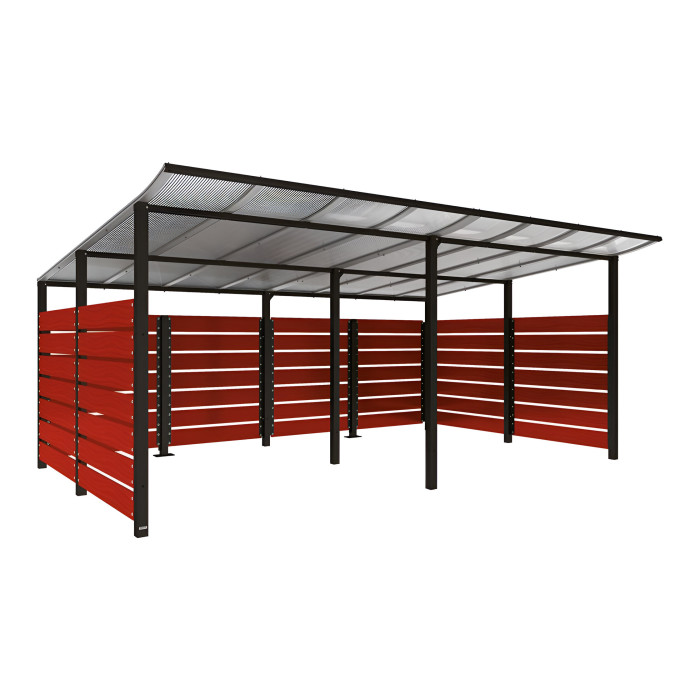 Durable and adaptable solution for organized waste container storage. Stability, functionality, and modern appearance. Anodized aluminum roof with polycarbonate panels and compact wood side panels. Galvanized, powder-coated steel structure. Modular system for compact container spaces or larger collection stations.