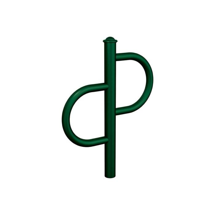 The S-shaped Province Tradition bicycle rack is a perfect fit for any environment, providing secure parking for bikes. The rack is made of steel and wood and is coated in a moss green color. It is designed for embedding into the ground for added stability.