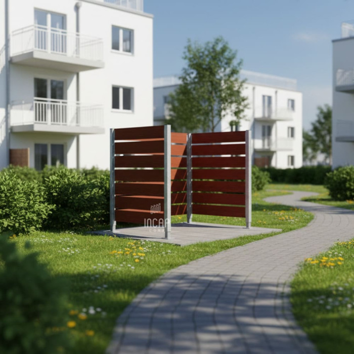 Hide your trash bins with our compact wood privacy screen. Versatile: fits 4x240L or 1x770L, 1x1100L. Stable with galvanized steel posts, mahogany-look wood panels. Dimensions: 1500 x 1500 mm. Recommended capacity: 4 x 240 L or 1 x 770 L / 1100 L.