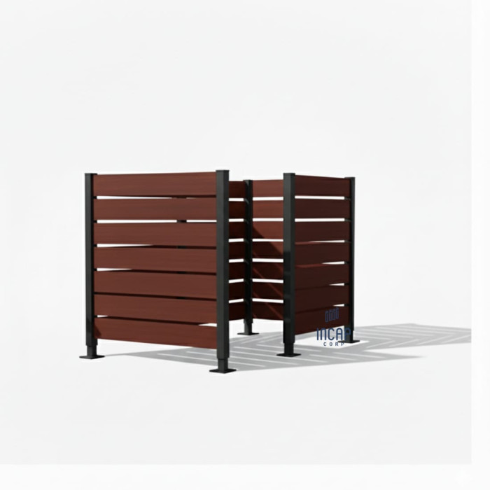 Wooden privacy screen for trash cans, made of compact wood. Standard sizes: 4x240L or 1x770L, 1x1100L. Stability provided by galvanized and powder-coated steel posts. Natural look with durable mahogany compact wood panels. Dimensions (WxH, mm): 1500 x 1500. Recommended capacity: 4 x 240 L or 1 x 770 L / 1100 L.