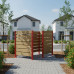 Outdoor privacy screen for trash cans made of compact wood, standard: 4x240L or 1x770L, 1x1100L. Stability provided by hot-dip galvanized and powder-coated steel posts. Natural appearance thanks to durable compact wood panels. Dimensions (WxD, mm): 1500 x 1500.