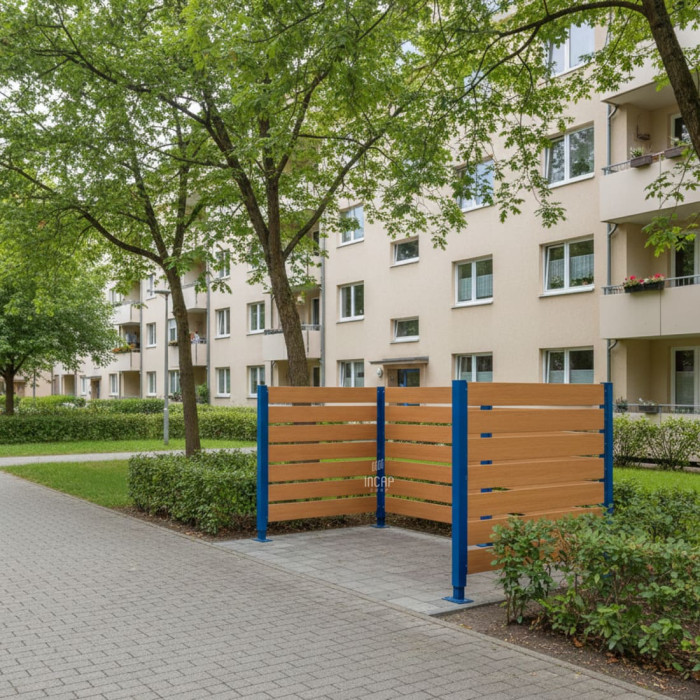 The natural appearance of the screen, available in light oak and mahogany finishes, allows for harmonious integration into outdoor areas and emphasizes the material's sustainability. The high-quality cladding with 13 mm thick compact laminate panels and easy self-assembly as a kit offer a flexible solution for discreetly cladding garbage bins and large containers.