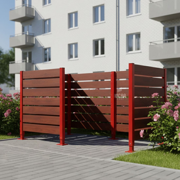 Complete set: Cladding + Posts. Cladding: Wide 750 mm - 2 pcs, Wide 1500 mm - 3 pcs. Posts: Intermediate posts - 1 pc, Corner posts - 3 pcs, End posts - 2 pcs. The waste bin enclosure harmonizes perfectly with the surroundings and integrates aesthetically into the outdoor area.