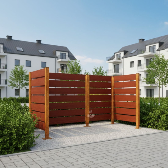 The Garbage Bins Privacy Screen made of Compact Laminate offers an aesthetic solution for concealing outdoor garbage bins. With dimensions of 1500x2250 mm and a Rust Corten Effect, it provides a modern and appealing look to your outdoor space. This complete set not only enhances the aesthetics but also protects against prying eyes and weather elements.