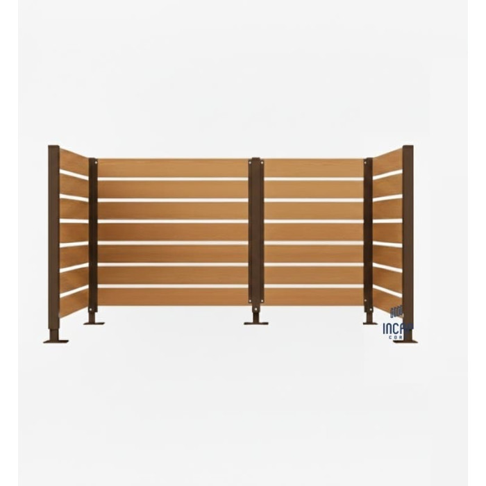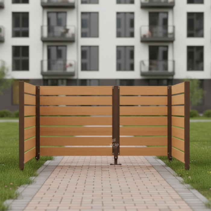 Complete Set: Enclosure + Posts. Enclosure: Wide 750 mm - 1 pc, Wide 1500 mm - 3 pcs. Posts: Intermediate posts - 1 pc, Corner posts - 2 pcs, End posts - 2 pcs. The garbage bin enclosure offers harmonious integration into outdoor areas.