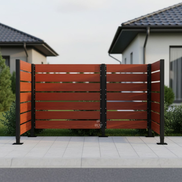 Complete set: Enclosure + Posts. Enclosure: Wide 750 mm - 1 pc, Wide 1500 mm - 3 pcs. Posts: Intermediate posts - 1 pc, Corner posts - 2 pcs, End posts - 2 pcs. The garbage bin enclosure harmonizes perfectly with the surroundings and integrates aesthetically into the outdoor area.