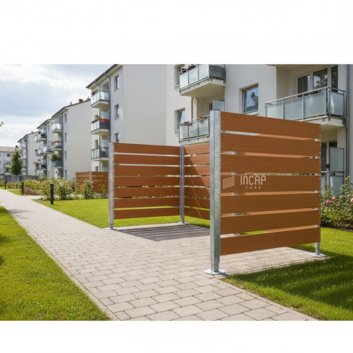 Complete set: Covering + posts. Covering: Width 1500 mm - 4 pcs. Posts: Intermediate posts - 1 pc., Corner posts - 2 pcs., end posts - 2 pcs. The garbage can enclosure blends in perfectly with its surroundings and integrates aesthetically into the outdoor area.