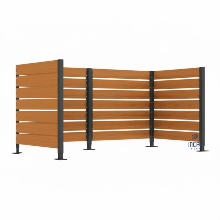 The complete set includes cladding and posts. The cladding is 1500 mm wide and comes with 4 posts, including an intermediate post, two corner posts, and two end posts, ensuring a harmonious integration into outdoor areas.