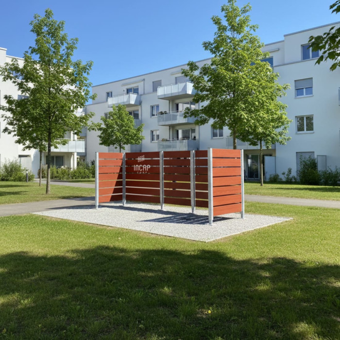 The garbage bin privacy screen made of compact laminate is a high-quality solution known for its modularity and flexible expandability. The complete set is delivered as a kit and includes all necessary cladding elements and matching posts. The easy self-assembly allows for quick installation on ground plates.