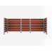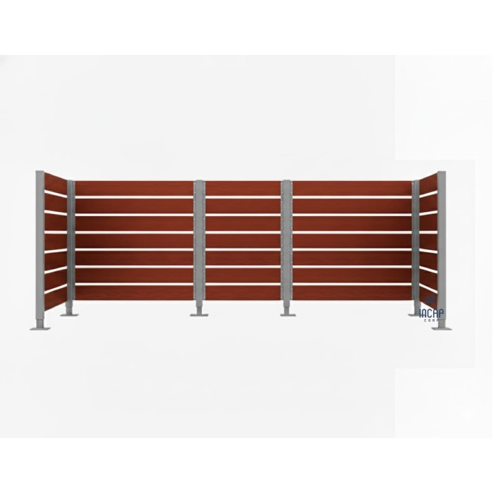 Wooden screen for trash cans, Extended range: 3x1100L or 10x240L. Stable with galvanized and powder-coated steel posts. Natural look with durable mahogany compact wood panels. Dimensions: 1500 x 3750 mm.