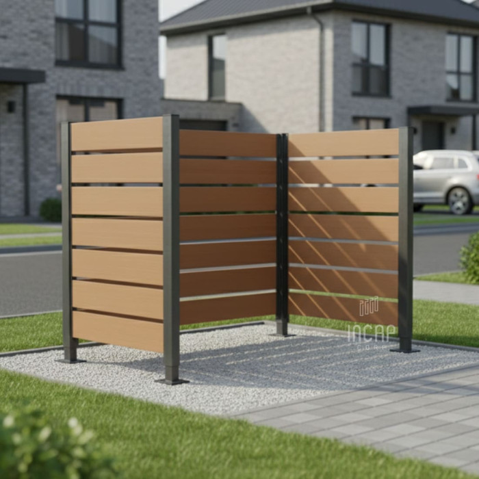 Complete Set: Enclosure + Posts. The enclosure consists of two 750 mm wide and one 1500 mm wide panels, along with two corner posts and two end posts, ensuring a harmonious integration into your outdoor space.