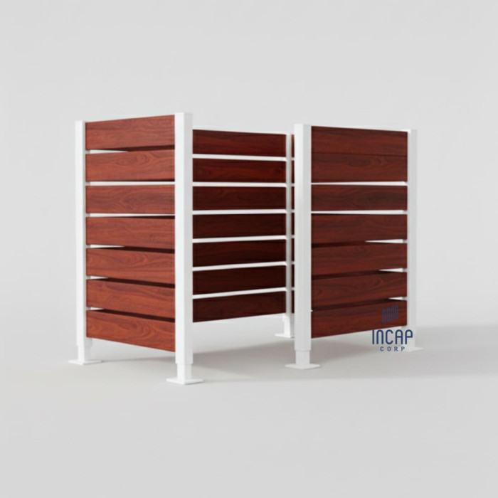 Complete set: Cladding + posts. Cladding: Wide 750 mm - 3 pcs, Wide 1500 mm - 1 pc. Posts: Corner posts - 3 pcs, End posts - 2 pcs. The trash can enclosure offers harmonious integration into outdoor areas.