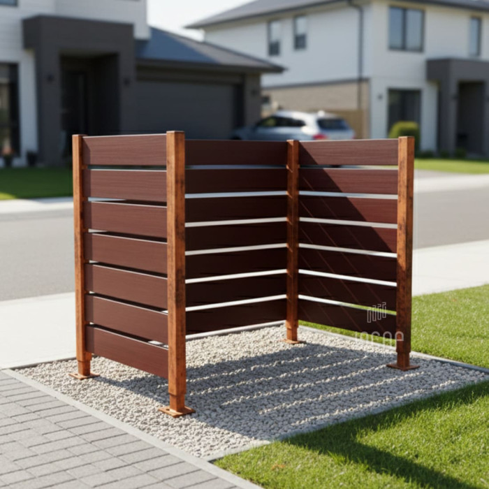 Main attributes Garbage Bins Privacy Screen made of Compact Laminate – Complete Set (750x1500 mm, Rust Corten Effect)