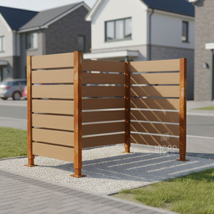 Main attributes Garbage Bins Privacy Screen made of Compact Laminate – Complete Set (750x1500 mm, Rust Corten Effect)