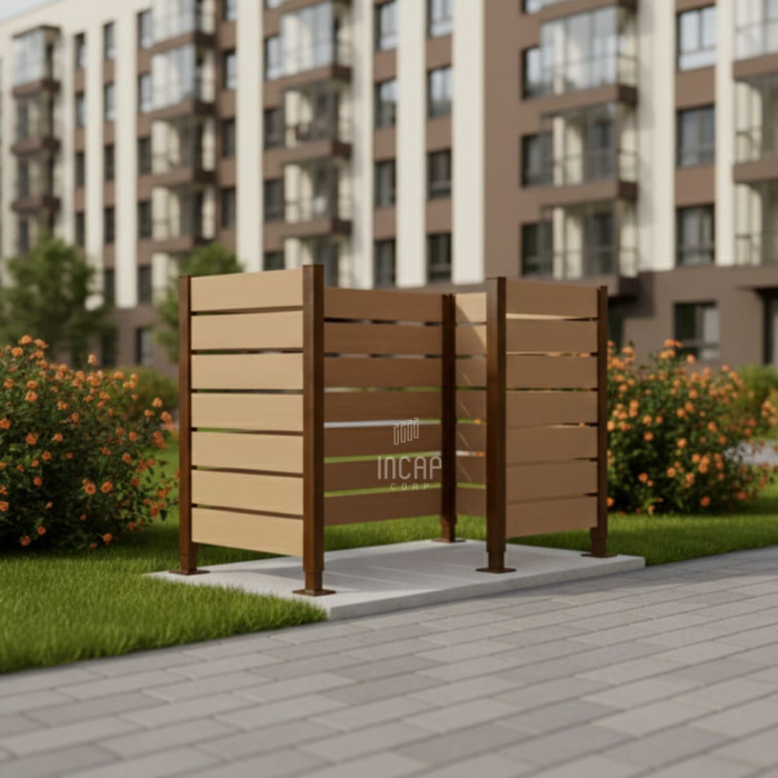 The garbage bin enclosure is actively used in Germany, Austria, Switzerland, Liechtenstein, the Netherlands, Denmark, Belgium, France, England, and other EU countries.