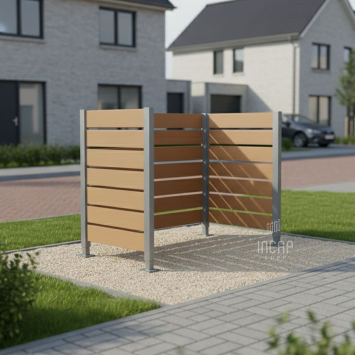 Complete Set: Cladding + Posts. Cladding: Wide 750 mm - 2 pcs, Wide 1500 mm - 1 pc. Posts: Corner posts - 2 pcs, End posts - 2 pcs. The litter bins cladding offers harmonious integration into outdoor spaces.