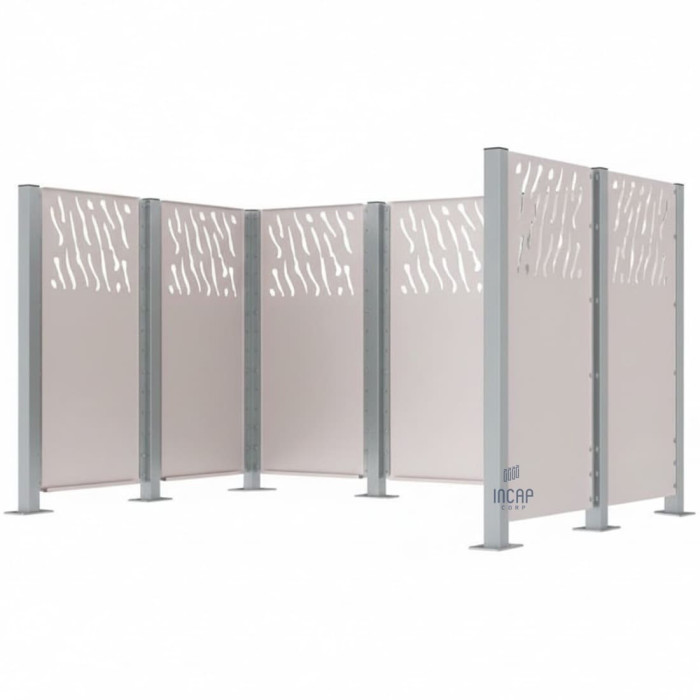 Complete Set: Enclosure + Posts. VENICE Enclosure: Wide 737 mm - 8 pcs. Posts: Intermediate Posts - 5 pcs., Corner Posts - 2 pcs., End Posts - 2 pcs. The garbage bin enclosure offers a harmonious integration into the outdoor space and provides an aesthetic enhancement.