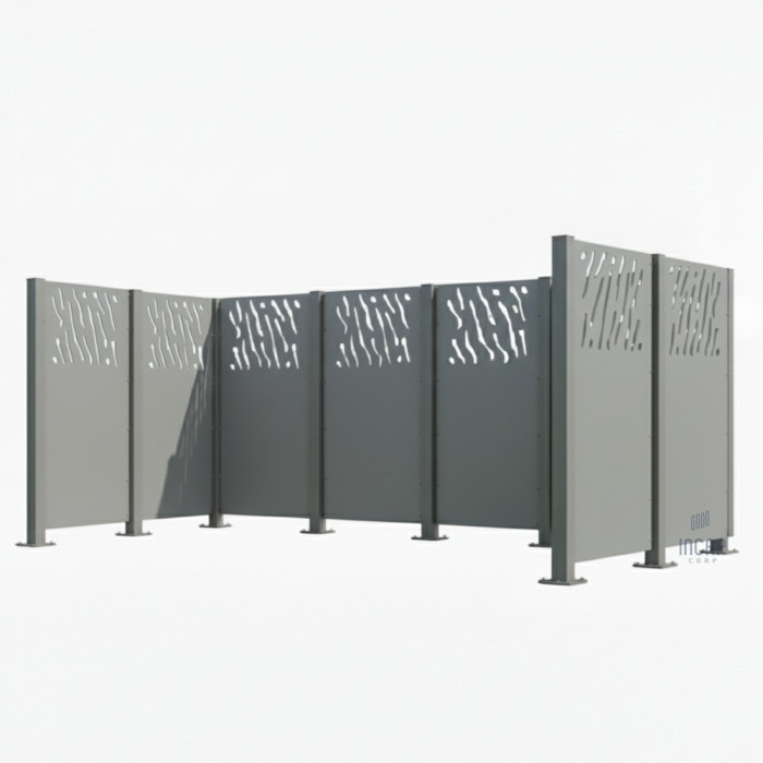 Complete Set: Enclosure + Posts. VENICE Enclosure: Wide 737 mm - 9 pcs. Posts: Intermediate Posts - 6 pcs., Corner Posts - 2 pcs., End Posts - 2 pcs. The garbage bin enclosure offers harmonious integration into outdoor areas and creates an aesthetic appearance.