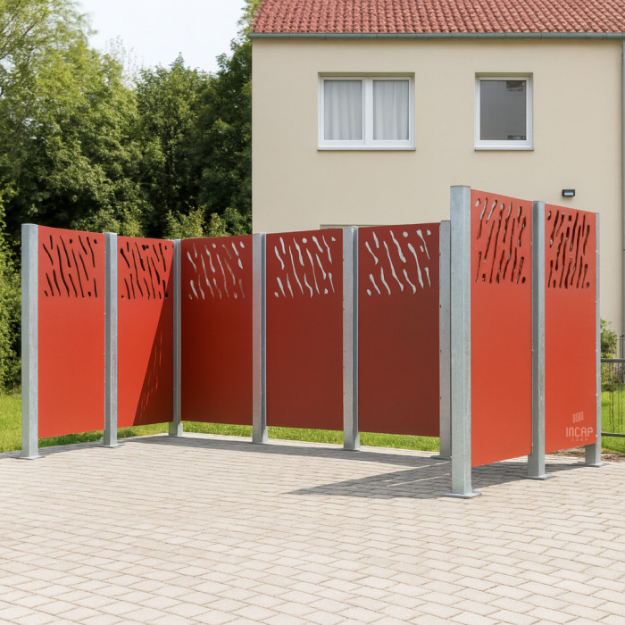 The waste bin privacy screen made of steel offers an aesthetic solution for concealing waste bins in outdoor areas. The complete set Venice in the dimensions of 1500x3700 mm in traffic red not only ensures a harmonious integration into the outdoor environment but also provides reliable protection against weather influences and unauthorized access.