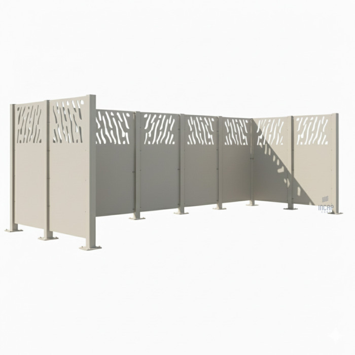 Garbage Bins Privacy Screen. VENICE Steel Enclosure. Posts on Base Plate Fixed - Hot-Dip Galvanized and Coated. This complete set is delivered as a kit and includes all necessary enclosure elements and matching posts. The modular design allows for flexible expansion for different numbers of bins (e.g., 3x120L or 2x240L).