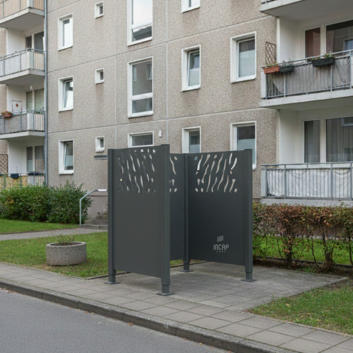The assembled steel trash bin privacy screen from PROCITY combines practical function with an appealing, high-quality design. The sturdy steel enclosures are 2 mm thick, hot-dip galvanized, and coated in our RAL colors, creating a warm appearance. The durable compact laminate (HPL) is weather-resistant, UV-stable, and easy to maintain.