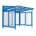 The frames are made of steel posts, hot-dip galvanized and painted in Gentian Blue. The roof is made of UV-resistant polycarbonate sheeting, while the side and back walls are made of aluminum frames and UV-resistant polycarbonate sheeting.