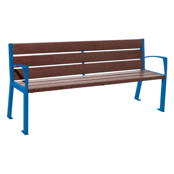 The seat consists of 6 slats of 40mm wide recycling plastic in gentian blue, supported by a sturdy steel structure. This ensures high load capacity and longevity. The optional armrests (8mm thick) made of recycling plastic provide additional comfort.