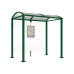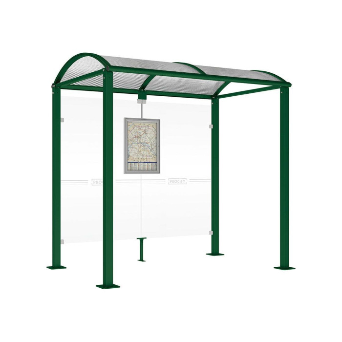 A high-quality bus waiting shelter with a simple design that harmoniously fits into rural and urban environments. Available in two lengths: 2500 or 5000 mm. The overall depth is 1600 mm. The shelter features square posts made of 80 x 80 mm steel tubes on base plates, with a height under the roof of 2500 mm. The roof is made of curved 6mm polycarbonate sheets with UV protection, supported by aluminum tube struts and gutters. The sides and back are covered with 8mm Securit glass panels, secured by a brushed aluminum clamping system. It also includes a timetable display case and options for advertising using a lightbox or display case "2000". The shelter is available in various RAL colors, comes pre-galvanized, and can be installed on base plates.