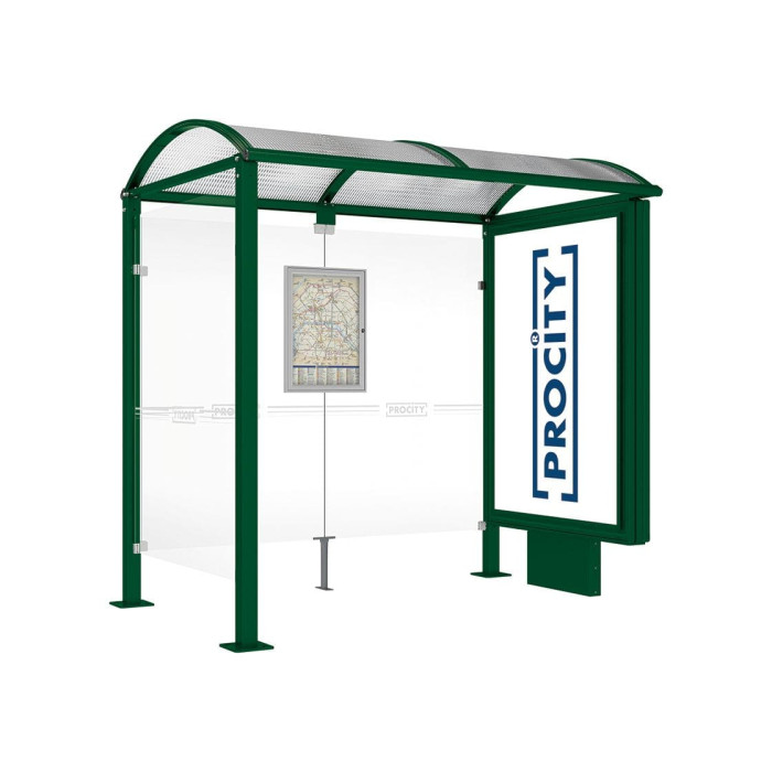 Eine hochwertige Buswartehalle mit schlichtem Design, die sich harmonisch in ländliche und städtische Umgebungen einfügt. Die PROCITY WarteHalle Vierkantrohr ist in zwei Längen erhältlich: 2500 oder 5000 mm. Die Gesamttiefe beträgt 1600 mm. Die Wartehalle verfügt über eckige Pfosten aus Stahlrohr (80 x 80 mm) auf Bodenplatten und eine Höhe unter dem Dach von 2500 mm. Das Dach besteht aus gewölbten Polycarbonatplatten (6 mm) mit UV-Schutz, während die Dachstruktur aus Aluminiumrohr-Streben (40 x 60 mm) und Rinnen aus Aluminiumprofil besteht. Die Seiten- und Rückseitenverkleidung besteht aus Securit-Glas (8 mm) und wird durch ein Klemmsystem aus gebürstetem Aluguss befestigt. Die Wartehalle bietet Platz für einen Fahrplanschaukasten (750 x 550 mm) sowie einen Leuchtkasten oder Schaukasten "2000". Sie ist feuerverzinkt und kann in verschiedenen RAL-Farben beschichtet werden. Die Montage erfolgt auf Bodenplatten.