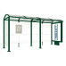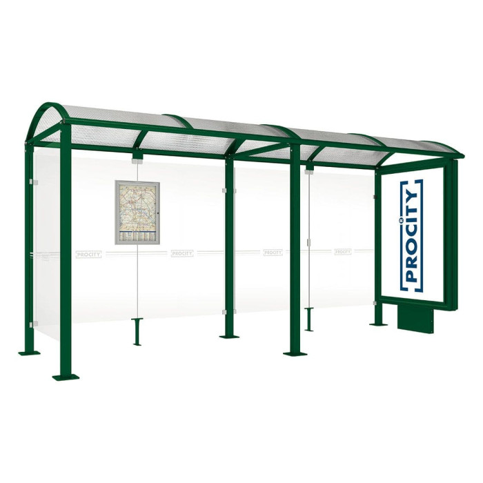 A high-quality bus waiting shelter with a simple design that harmoniously fits into rural and urban environments. Available in two lengths: 2500 or 5000 mm. The overall depth is 1600 mm. The shelter features square posts made of 80 x 80 mm steel tubes on base plates. The height under the roof is 2500 mm. The roof is made of arched polycarbonate panels, 6 mm with UV protection. The roof structure includes aluminum tube struts, 40 x 60 mm, and gutters made of aluminum profile. The sides and rear are covered with Securit glass, 8 mm thick, which is attached using a clamping system made of brushed aluminum casting. It also includes a timetable display case and an advertising lightbox or display case "2000". The shelter is available in various RAL colors for coating and can be mounted on base plates.