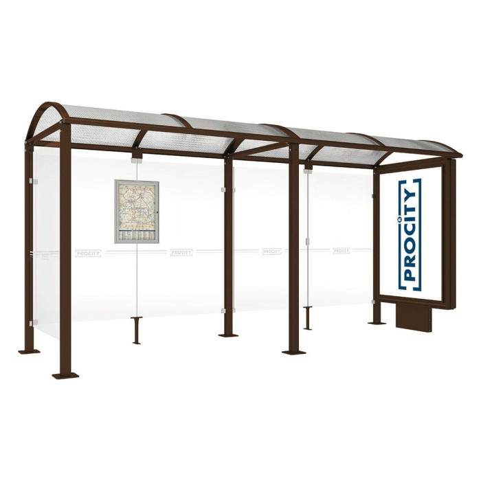 Eine hochwertige Buswartehalle mit schlichtem Design, die sich harmonisch in ländliche und städtische Umgebungen einfügt. Die PROCITY Wartehalle Vierkantrohr ist in zwei Längen erhältlich: 2500 oder 5000 mm. Mit einer Gesamttiefe von 1600 mm bietet sie ausreichend Schutz vor den Elementen. Die eckigen Pfosten bestehen aus Stahlrohr 80 x 80 mm und sind auf Bodenplatten montiert. Die Höhe unter dem Dach beträgt 2500 mm. Das Dach besteht aus gewölbten Polycarbonatplatten, 6 mm stark und mit UV-Schutz. Die Dachstruktur besteht aus Aluminiumrohr-Streben, 40 x 60 mm, und Rinnen aus Aluminiumprofil. Die Seiten- und Rückseitenverkleidung bestehen aus Securit®-Glas, 8 mm stark. Sie wird durch ein Klemmsystem aus gebürstetem Aluguss befestigt. Die Buswartehalle verfügt über einen Fahrplanschaukasten mit den Maßen 750 x 550 mm (4 A4) und einen Leuchtkasten oder Schaukasten "2000" zur Information und Werbung.