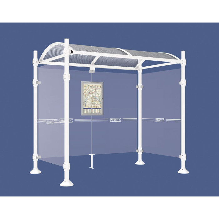Available in two lengths: 2500 or 5000 mm, the overall depth of the shelter is 1600 mm. The round posts are made of 3mm thick aluminum pipe with a diameter of ø 76 mm, mounted on base plates. The roof is made of arched polycarbonate panels, 6mm thick with UV protection. The roof structure consists of two aluminum tube struts, 40 x 60 mm, and two gutters made of aluminum profile. The sides and back panels are made of Securit glass, 8mm thick, and are fastened using an aluminum die-cast clamping system. The shelter also includes a timetable display case and options for information and advertising display cases.