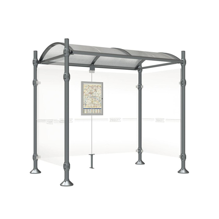 Available in two lengths: 2500 mm or 5000 mm, the shelter features aluminum round posts with a diameter of 76 mm and a thickness of 3 mm, mounted on floor plates. The roof is made of curved polycarbonate panels, 6 mm thick with UV protection. The roof structure consists of two aluminum tube struts, 40 x 60 mm, and two aluminum profile gutters. The sides and rear panels are made of Securit glass, 8 mm thick, securely fastened using an aluminum die-casting clamping system. It also includes a display case for schedules and options for information and advertising displays.
