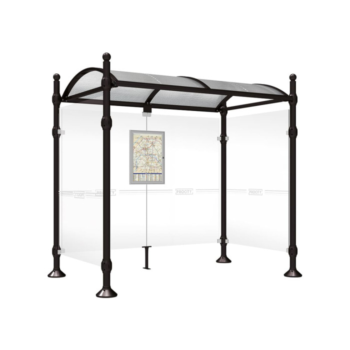 The Bushaltestelle Province comes with 4 head models to choose from, along with different mounting clamps and cover feet. It is available in two lengths: 2500 or 5000 mm, with a total depth of 1600 mm. The structure includes aluminum round posts, 3mm thick, ø 76mm, on base plates, and features curved polycarbonate roof panels with UV protection. The sides and rear are covered with Securit glass (8mm) and can be customized in our RAL colors. The shelter also includes a display case for schedules and options for information and advertising displays.