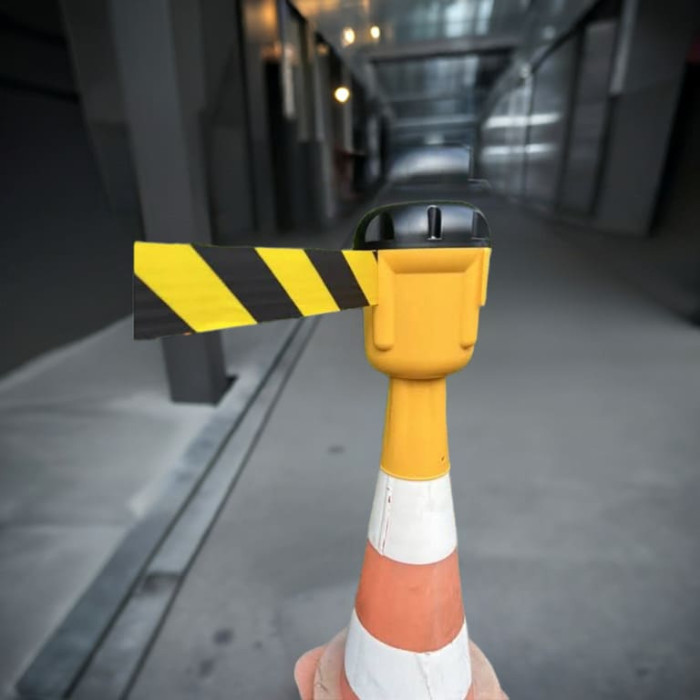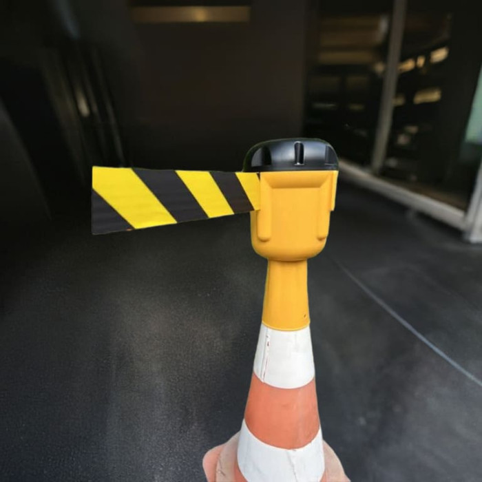 Our traffic cone attachment is an indispensable product for securing construction sites, events and other areas where clear demarcation is required. The 10 meter long belt strip in black and yellow ensures clear visibility and safety. The cassette body in yellow color is sturdy and durable, which ensures long-term use.