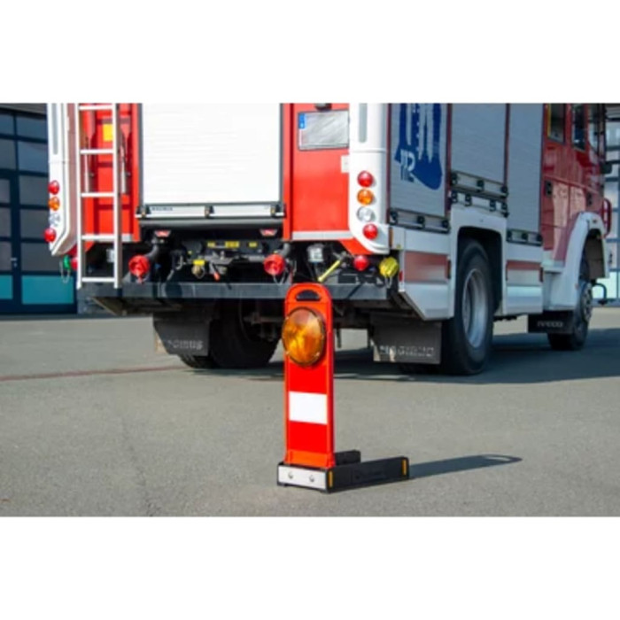 The FlashMax LED warning light represents a benchmark in rapid deployment technology, engineered for optimal safety and visibility in emergency situations. Its innovative stackable stainless steel base, combined with a robust dual-joint folding mechanism, ensures ease of transport and setup. The optical performance is enhanced by dual-sided reflective sheeting that meets the stringent Class: BASt WL4 (EN 12352 L8M/L8L) standards, featuring a chevron pattern that mirrors high-visibility traffic cones for maximum effectiveness. Weighing only Atributi kg, this unit maintains stability against Force 9 wind loads, making it reliable under adverse conditions. The ergonomic carry handle facilitates easy maneuverability, while the protective film edge enhances durability. Additionally, the hybrid battery system—comprising four LR14 batteries and a 9V backup—ensures extended operational time. When folded, its compact dimensions of Atributi x Atributi x Atributi cm allow for efficient storage in vehicles.